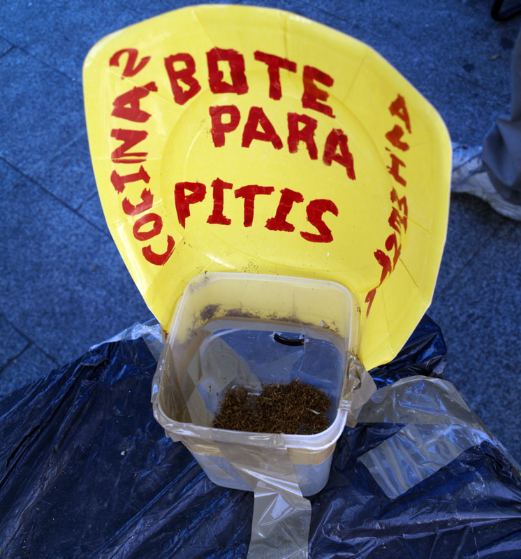 Dos miembros de alguna de las más de 15 comisiones que funcionan en el campamento limpian un colchón con escobas.