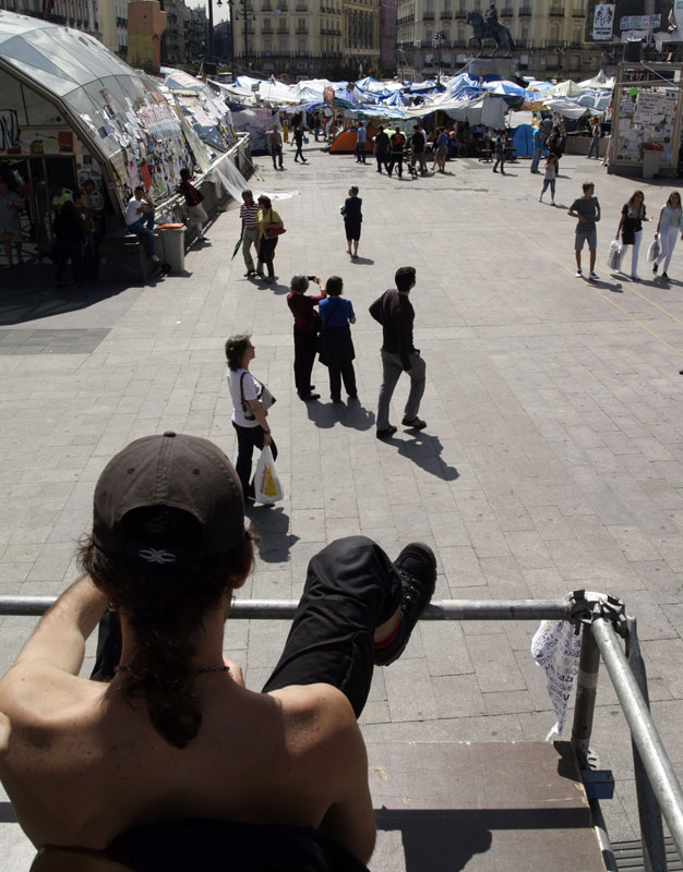 Un acampado mira orgulloso el campamento desde una plataforma que dejó ahí plantada una cadena de televisión. Es el amo de la plaza.