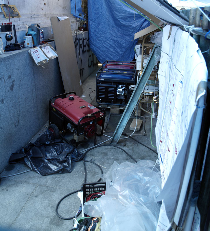Tres generadores de gasóleo junto a la estatua de Carlos III debidamente escamoteados.