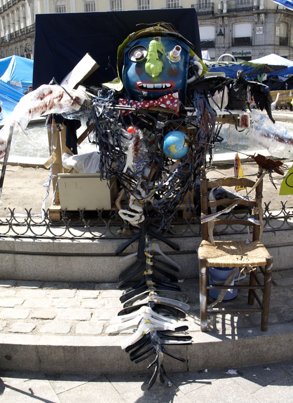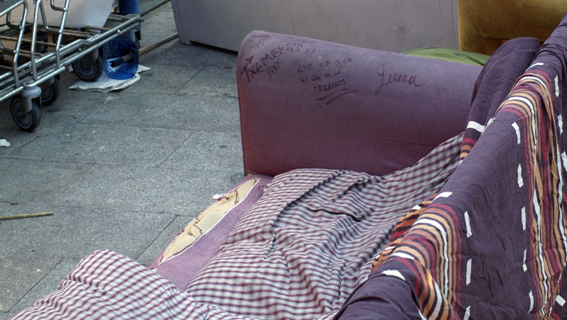 Este sofá que parece sacado de un vertedero ha sido personalizado por eslóganes "indignados".