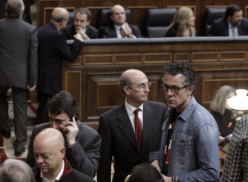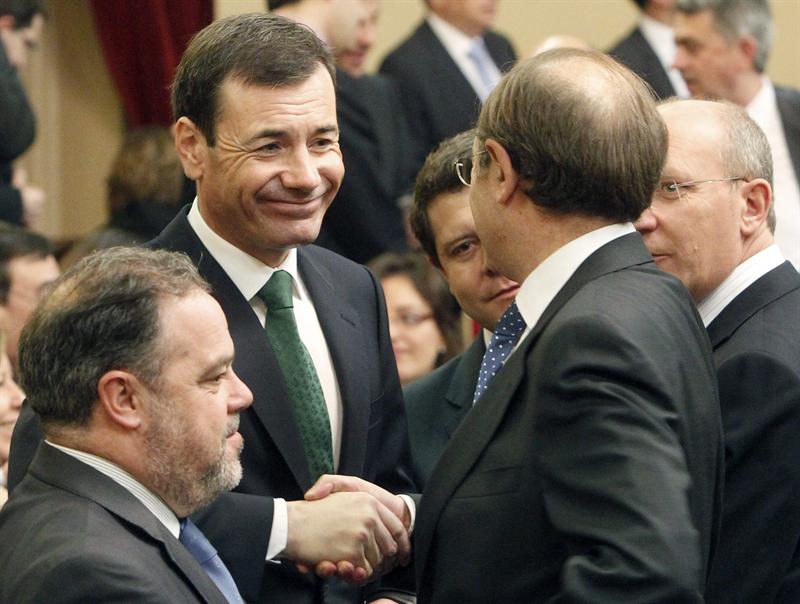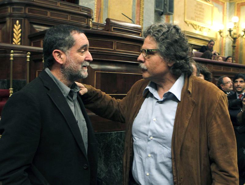 El diputado de ERC Joan Tardá (d) conversa con el diputado de Amaiur poco antes de la sesión de constitución del Congreso en la que toman posesión de sus escaños los parlamentarios de la X legislatura