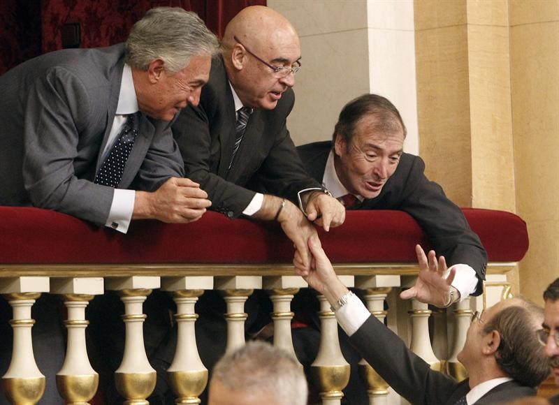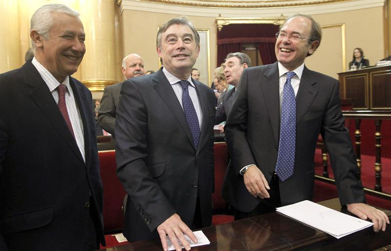 Pío García Escudero (d), elegido esta mañana presidente de la Cámara Alta, bromea junto al próximo portavoz popular, José Manuel Barreiro (c), y a Javier Arenas, líder del PP en Andalucía, antes de la sesión constitutiva del Senado, en la que toman posesión de sus escaños los parlamentarios de la X legislatura