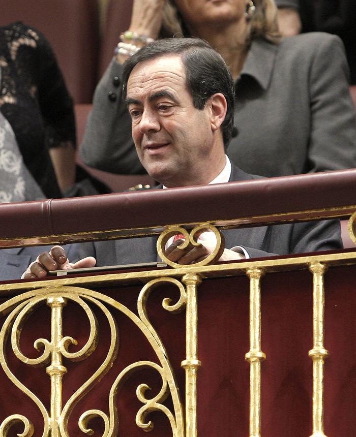 El expresidente del Congreso José Bono, sentado en la tribuna de invitados, antes del comienzo de la sesión constitutiva de la Cámara Baja en la que toman posesión de sus escaños los parlamentarios de la X legislatura y en la que el popular Jesús Posada ha sido nombrado nuevo presidente del Parlamento