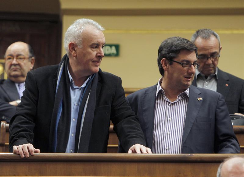 El coordinador general de IU, Cayo Lara, y el diputado de la formación José Luis Centella durante la sesión de constitución del Congreso en la que toman posesión de sus escaños los parlamentarios de la X legislatura
