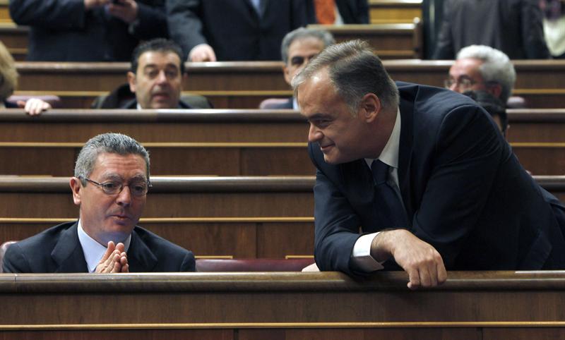 Los diputados populares Esteban González Pons y Alberto Ruíz Gallardón conversan en el hemiciclo antes de iniciarse la sesión constitutiva del Congreso de la X Legislatura