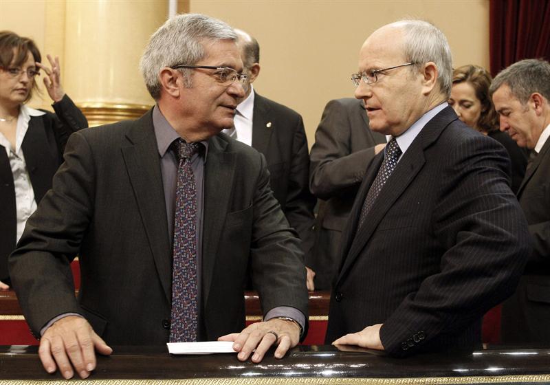 El presidente de ICV, Joan Saura (i), conversa con el expresidente de la Generalidad y designado senador en representación del Parlamento catalán, José Montilla, antes de la sesión constitutiva del Senado, en la que toman posesión de sus escaños los parlamentarios de la X legislatura
