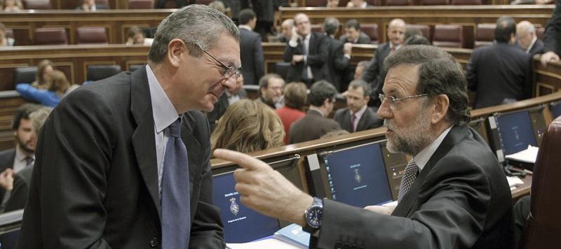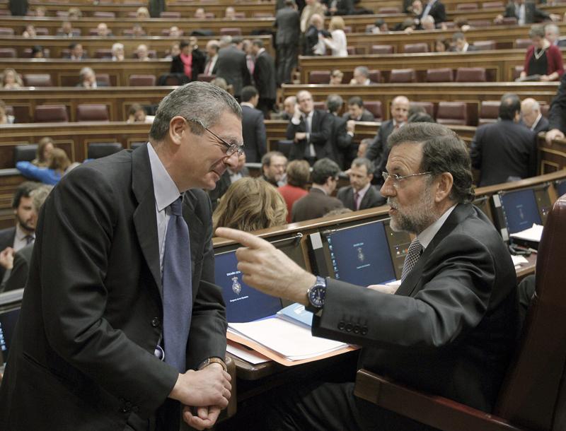 El líder popular, Mariano Rajoy (d), conversa con el diputado Alberto Ruiz Gallardón durante la sesión constitutiva de la Cámara Baja de la X Legislatura