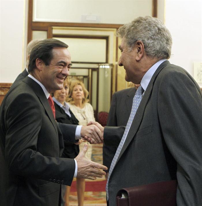 El próximo presidente del Congreso, Jesús Posada (d), saluda a su antecesor en el cargo, José Bono, antes de la sesión constitutiva de la Cámara Baja en la que toman posesión de sus escaños los parlamentarios de la X legislatura