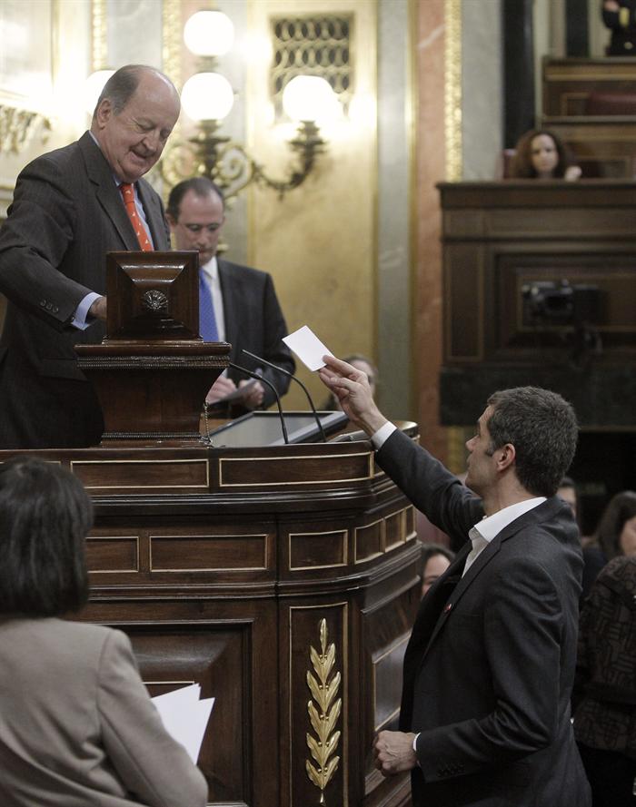 Xabier Mikel Errekondo (d), diputado de Amaiur, se dirige a la mesa para depositar su voto en la elección del presidente de la Cámara, durante la composición del Congreso de los Diputados de la X Legislatura