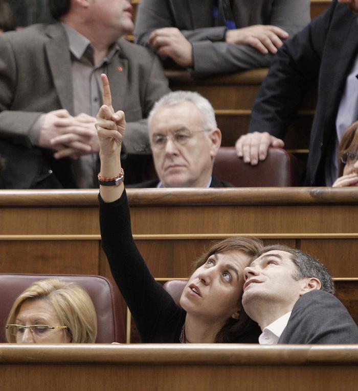 Junto a la lider de grupo, Rosa Díez (izda.), la diputada de UPyD Irene Lozano señala a su compañero Toni Cantó los impactos de los disparos del 23F en el techo del hemiciclo, durante la sesión constitutiva de la Cámara del Congreso de los diputados