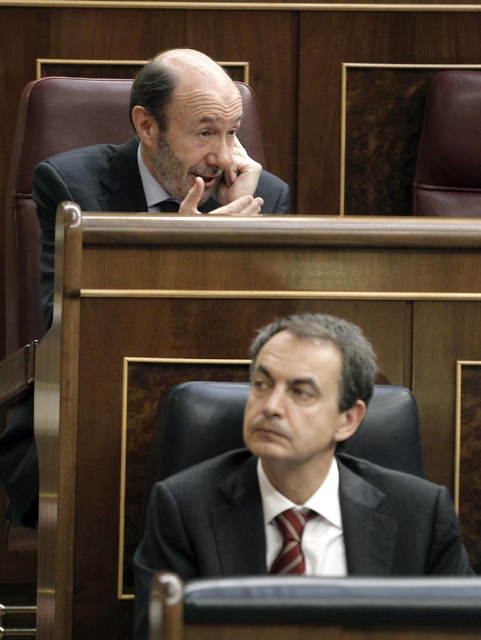El presidente del gobierno en funciones, José Luís Rodríguez Zapatero, y el portavoz socialista en el Congreso, Alfredo Pérez Rubalcaba (arriba), durante la sesión constitutiva de la Cámara Baja de la X Legislatura
