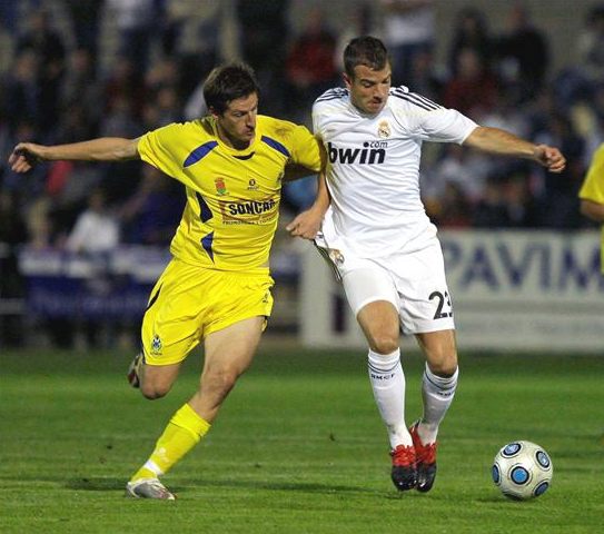 El centrocampista holandés Rafael van der Vaart (derecha) controla el balón ante Borja Pérez.
