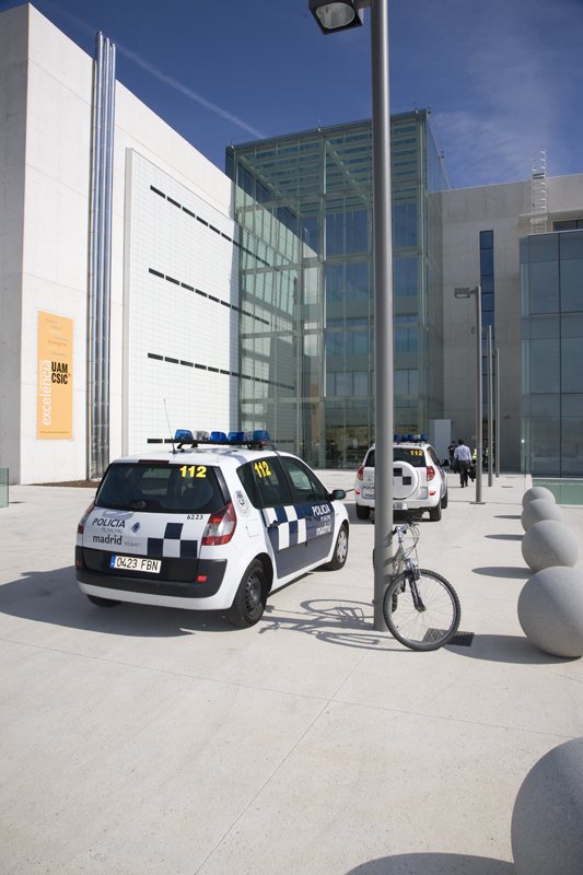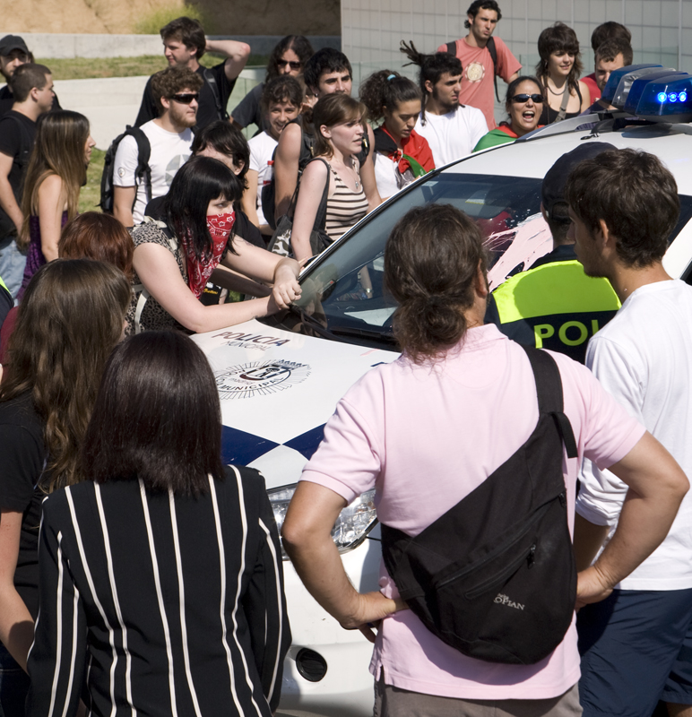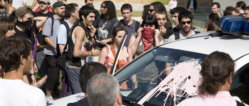 Estos dos coches patrullas eran la única dotación policial que seguía a la manifestación a pesar del talante claramente violento de sus participantes. Al Toyota del fondo los manifestantes le tenían reservado un linchamiento automovilístico.