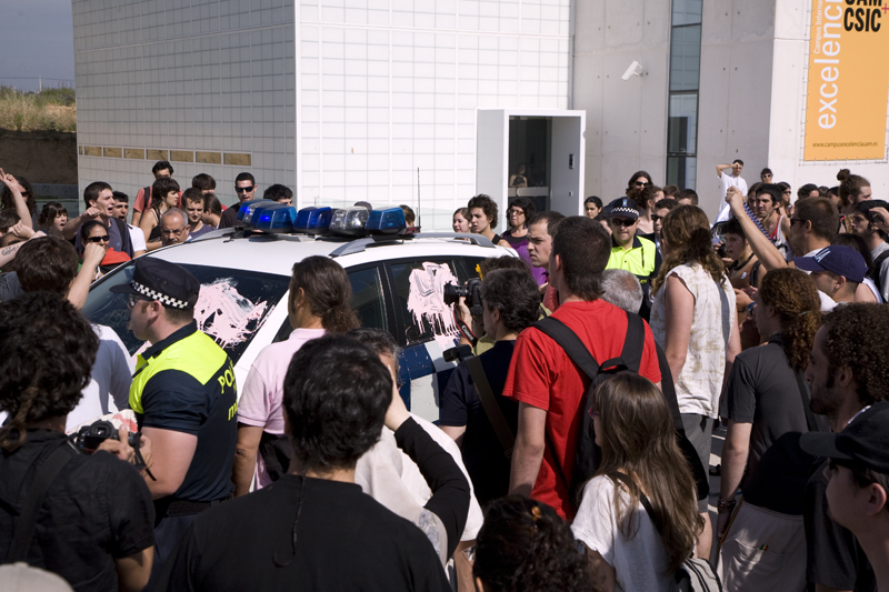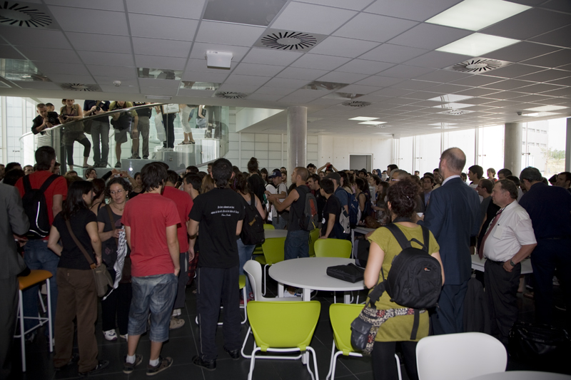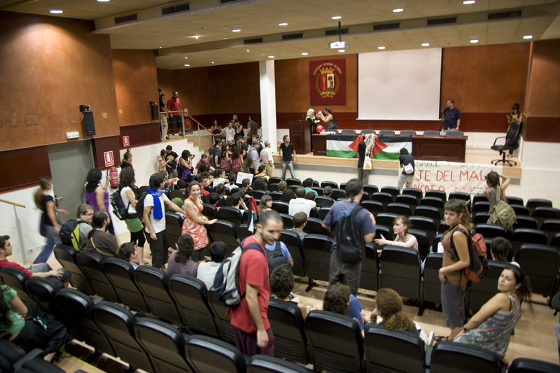 Ante la pasividad de los guardias de seguridad y de la misma Policía Municipal los manifestantes han ocupado el salón de actos del Edificio C de la universidad. Una vez dentro se han aplastado y uno de los cabecillas se ha marcado un mitin.