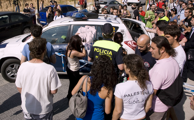 Los manifestantes se han empleado a fondo con el Toyota policial. En la imagen una propalestina embozada se apoya sobre el capó del coche.