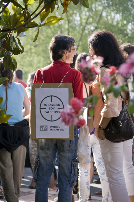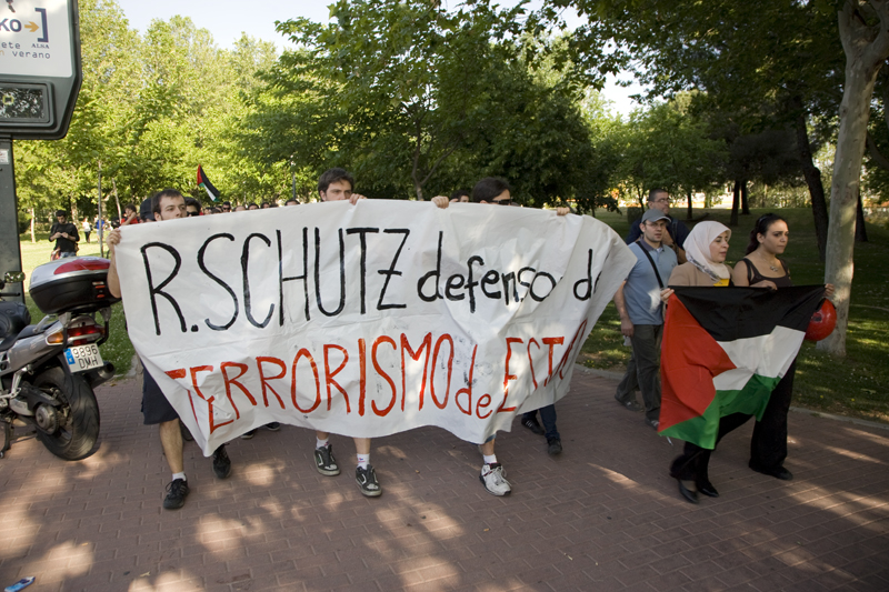 La cabecera de la manifestación la presidía esta pancarta contra el embajador de Israel el España, Rafael Schtuz. Al lado la representación "étnica" con el preceptivo pañuelo para dar a la marcha un toque oriental.