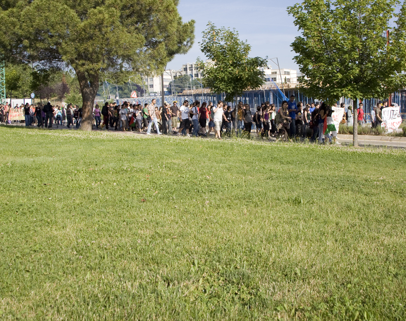 Y, claro, a veces sucede que son cinco o seis. En la imagen la manifestación al completo pasando junto a un prado del campus frente a las obras de la futura Plaza Mayor de la UAM.