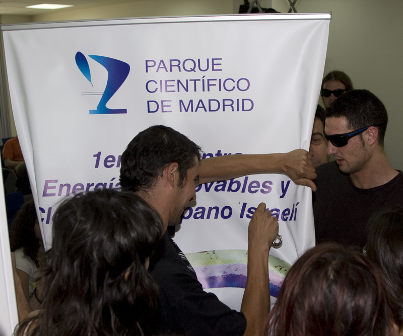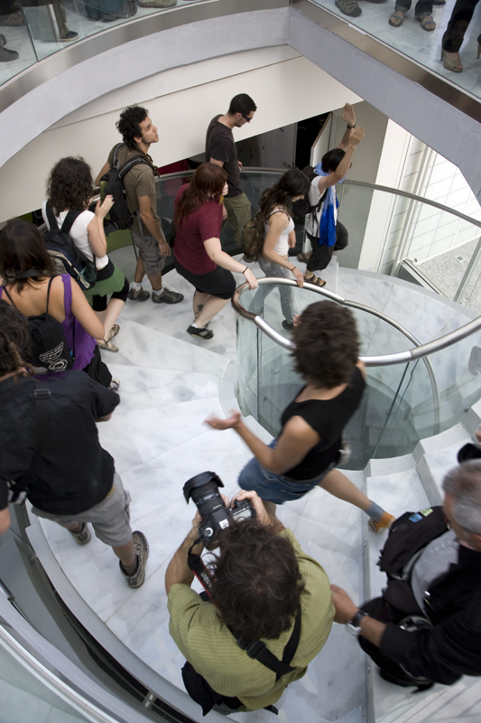 Los manifestantes bajan por la escalera de caracol del Parque Científico en dirección a la salita donde se celebraban las Jornadas Hispano-Israelíes sobre energías renovables y cleantech. Iban, como se ve en la fotografía, entusiasmados.