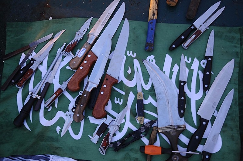 Una parte de la variedad de armas blancas que los "pacifistas" blandieron contra los soldados israelíes. Ni el mejor muestrario albaceteño...