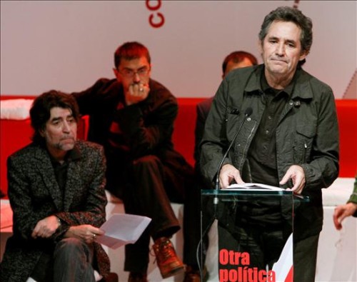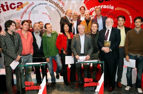 El cantautor Joaquín Sabina (izda); el escritor Luis García Montero (2 izda); los secretarios generales de UGT, Cándido Méndez (3 izda), y CCOO, Ignacio Fernández Toxo (5 dcha); el actor Juan Diego (4 izda), la escritora Almudena Grandes; el cantante Miguel Ríos (4 dcha); el rector de la Universidad Complutense, Carlos Berzosa (3 dcha), y el actor Juan Diego Botto (dcha), durante la presentación del manifiesto "Otra política y otros valores para salir de la crisis". (EFE/Sergio Barrenechea)