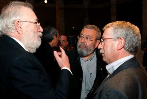 El rector de la Universidad Complutense, Carlos Berzosa, conversa con los secretarios generales de UGT, Cándido Méndez, y CCOO, Ignacio Fernández Toxo (izda-dcha), durante la presentación del manifiesto "Otra política y otros valores para salir de la crisis". (EFE/Sergio Barrenechea)