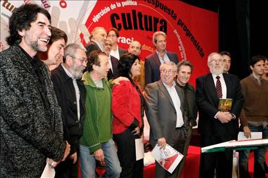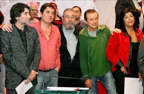 El cantautor Joaquín Sabina (izda); el escritor Luis García Montero (2 izda); los secretarios generales de UGT, Cándido Méndez (3 izda), y CCOO, Ignacio Fernández Toxo (3 dcha); el actor Juan Diego (4 izda), la escritora Almudena Grandes; el cantante Miguel Ríos (2 dcha), y el rector de la Universidad Complutense, Carlos Berzosa. (EFE/Sergio Barrenechea)