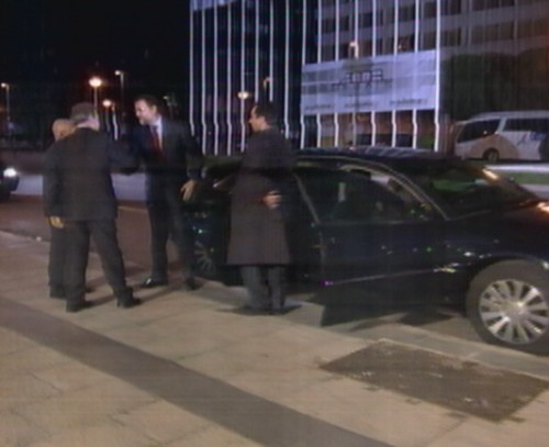 En la imagen, tras bajarse del coche, junto a Manuel Campo Vidal y el realizador Fernando Navarrete. (Imagen Televisión)