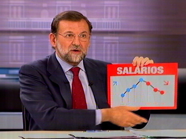 Rajoy muestra un gráfico sobre la evolución de los salarios en España. (Imagen Televisión)
