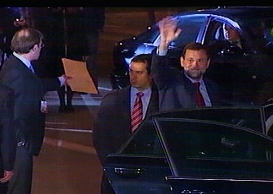 Momento en que llega Rajoy a la puerta del Palacio Municipal de Congresos en el recinto ferial de Madrid. (Imagen Televisión)