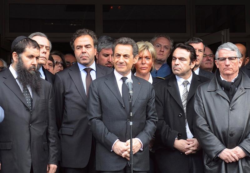 El presidente francés, Nicolás Sarkozy (c), pronuncia un discurso junto al ministro francés de Educación Luc Chatel (2i), y al alcalde de Toulouse, Pierre Cohen (d), en la escuela judía escuela judía "Ozar Hatorah" en Toulouse.