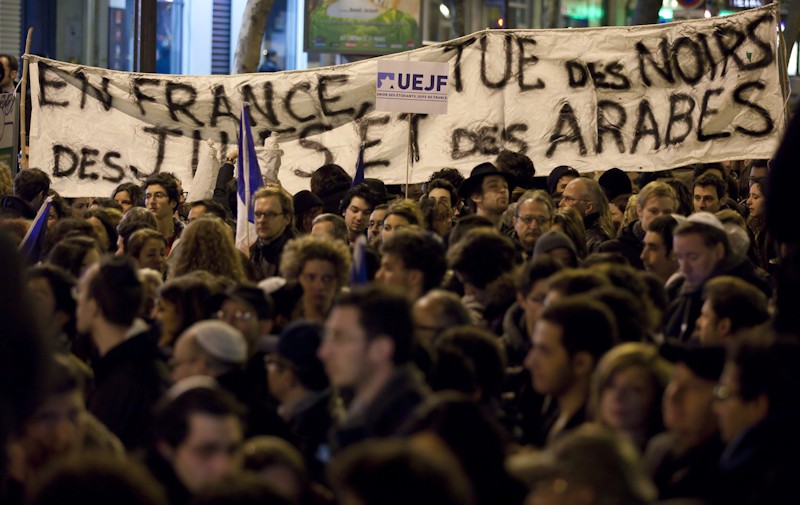 Manifestantes sostienen un cartel que dice: "En Francia, los negros, los judíos y los árabes son asesinados" durante una marcha silenciosa en honor de las víctimas.