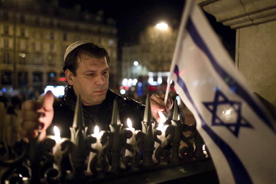 Un hombre enciende una vela durante una marcha silenciosa en honor de las víctimas del ataque a la escuela judía de Toulouse.