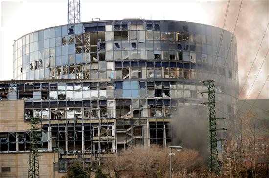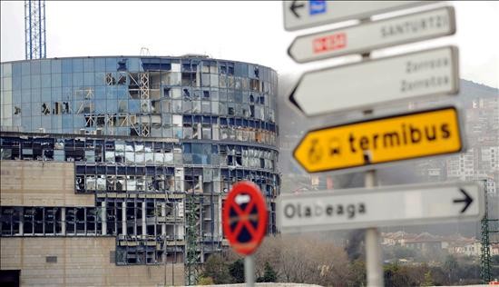 Así ha quedado la sede de la ETB en Bilbao después de que ETA hiciera estallar una furgoneta bomba a las puertas del edificio el último día de 2008. (EFE)