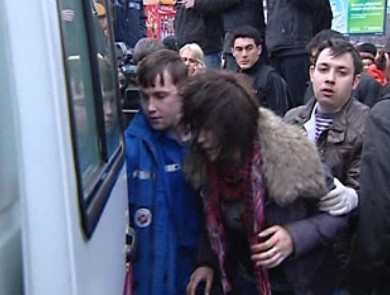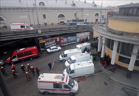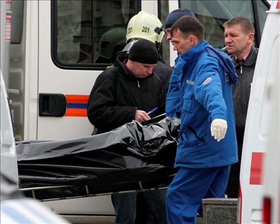 Un equipo sanitario retira uno de los cadáveres de la estación de metro de Lubyanskaya.