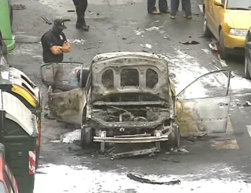 En la imagen, el renault megàne del escolta, Gabriel Giner, tras el incendio que ocasionó la explosión. (LDTV)