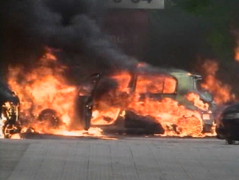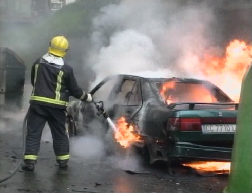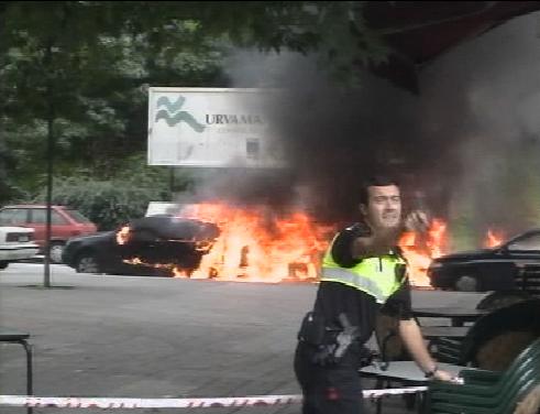 El coche quedó envuelto en llamas. Imágen tomada por un vecino del barrio con un teléfono móvil. (LDTV)