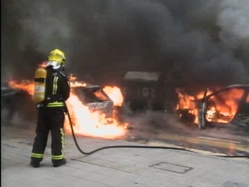 Un bombero trata de sofocar las llamas de los coches afectados por la explosión. (LDTV)