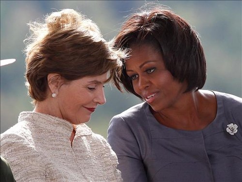 La primera dama estadounidense Michelle Obama y la exprimera dama Laura Bush (i) conversan durante una ceremonia conmemorativa de los atentandos.