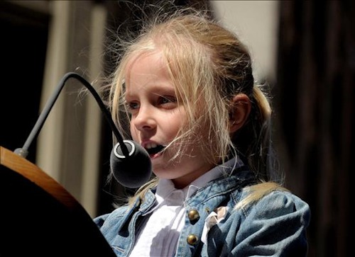 Una niña que perdió a su abuelo en los atentados del 11-S lee los nombres de las víctimas durante la ceremonia conmemorativa del noveno aniversario de los atentado.