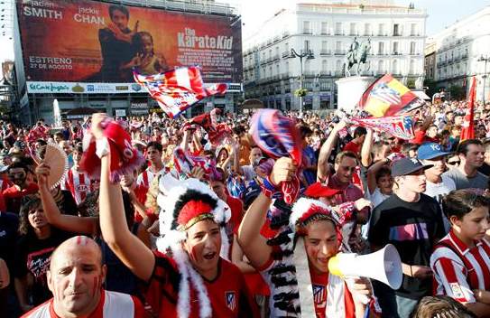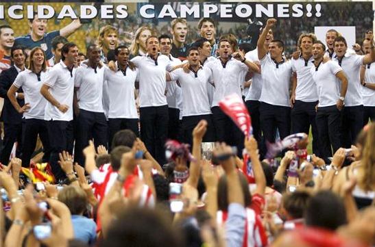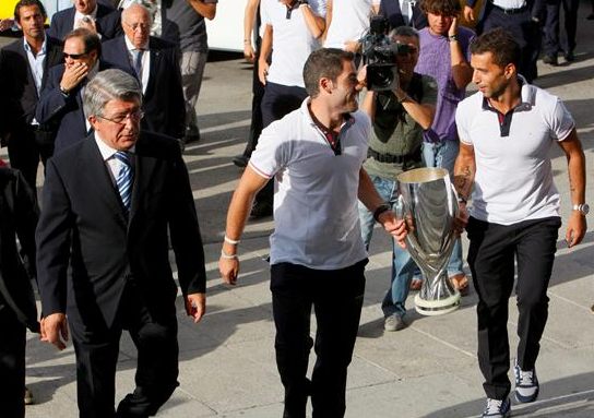 Los jugadores del Atlético de Madrid celebran con la afición la Supercopa de Europa esta tarde en el Ayuntamiento de Madrid donde han sido recibidos por el alcalde madrileño, Alberto Ruiz Gallardón.