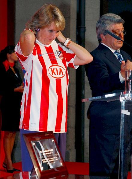 La presidenta de la Comunidad de Madrid, Esperanza Aguirre (i) se coloca la camiseta del Atlético de Madrid, ante el presidente del club, Enrique Cerezo (d), durante la recepción a la plantilla.
