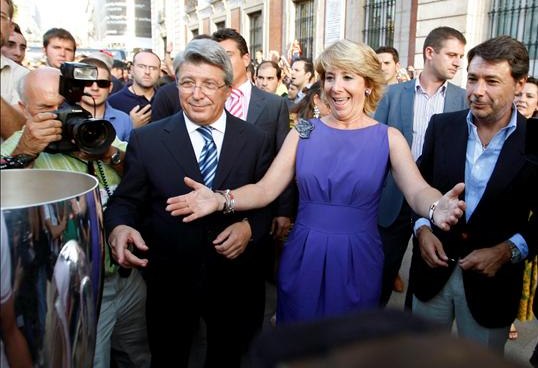 La presidenta de la Comunidad de Madrid, Esperanza Aguirre (c),junto al vicepresidente, Ignacio González (d) y al presidente del Atlético de Madrid, Enrique Cerezo (i), recibe la Supercopa de Europa.