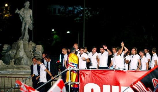 Los jugadores del Atlético de Madrid celebran con sus seguidores la Supercopa de Europa lograda por el equipo el pasado 27 de agosto, tras vencer al Inter de Milán en Mónaco, esta tarde en la plaza de Neptuno, en Madrid, escenario habitual de los festejos de los éxitos del Atleti.