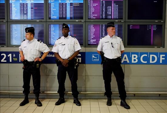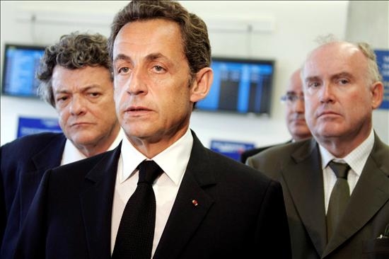 Nicolas Sarkozy, acompañado por el secretario de Estado de Transportes, Dominique Bussereau (d) y el ministro a cargo de Transportes, Jean Louis Borloo (i). En el avión de Air France la mayoría de los viajeros eran franceses. (EFE)