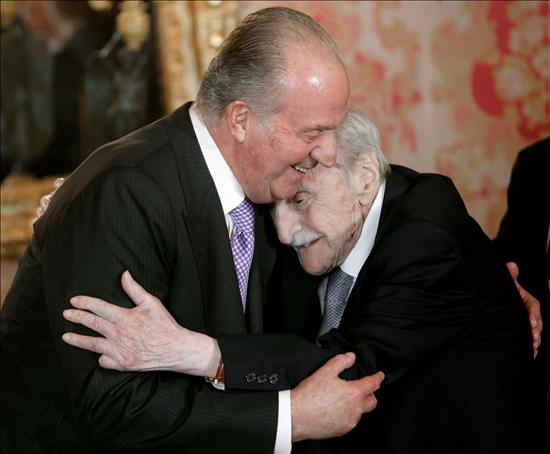 El escritor español Francisco Ayala falleció hoy en Madrid a los 103 años. En la fotografía de archivo, del 20 de abril de 2009, Ayala se abraza con el rey Juan Carlos al inicio del almuerzo que los monarcas ofrecieron con motivo de la entrega del premio Cervantes a Juan Marsé. EFE/Ángel Díaz