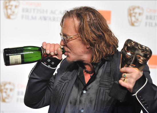 El actor estadounidense Mickey Rourke, ganador en la categoría de mejor actor protagonista celebra con una botella de champaña. (EFE)