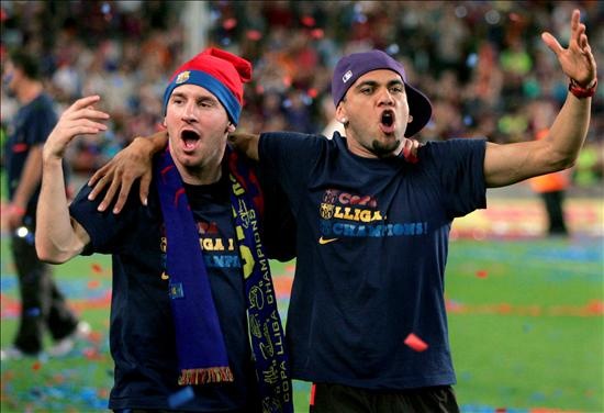 El argentino Leo Messi (i) y el brasileño Dani Alves, cantando en las celebraciones organizadas en el Camp Nou por la consecución de la Liga de Campeones. (EFE)