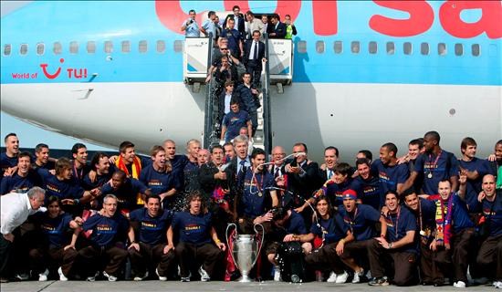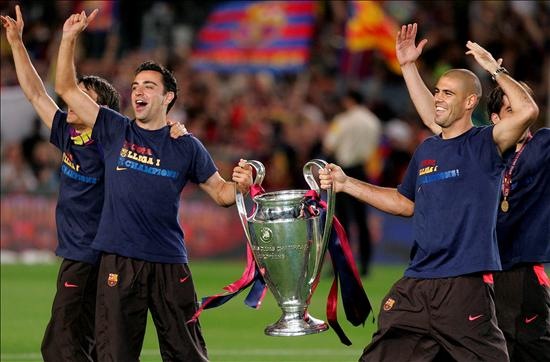 Xavi Hernández (i) y Victor Valdés, levantan el trofeo de la Liga de Campeones, durante el acto festivo celebrado en el Camp Nou. (EFE)