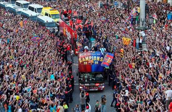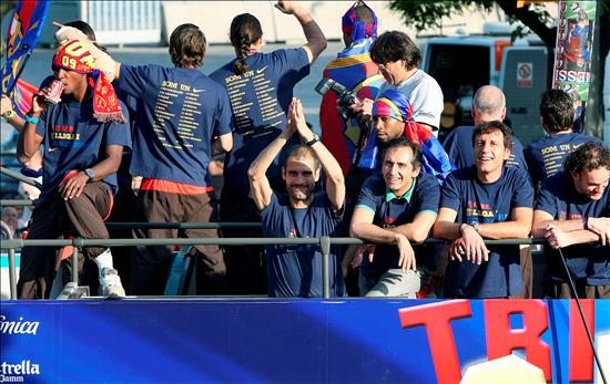El entrenador del FC Barcelona, Pep Guardiola (c), durante el recorrido de la plantilla del club por las calles de la ciudad condal. (EFE)