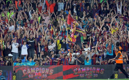 Los aficionados animan a su equipo durante el acto festivo celebrado en un Camp Nou a rebosar. (EFE)